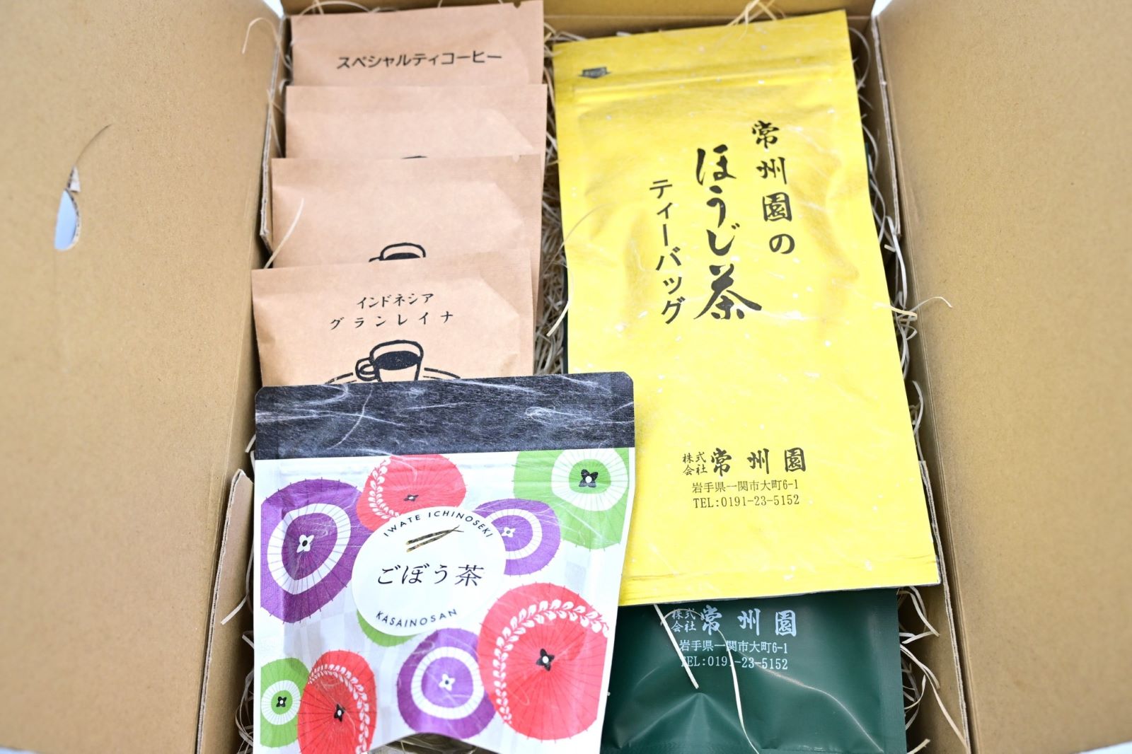 ごぼう茶、ドリップコーヒー(スペシャル、インドネシア、グアテマラ、ブラジル)、煎茶、紅茶