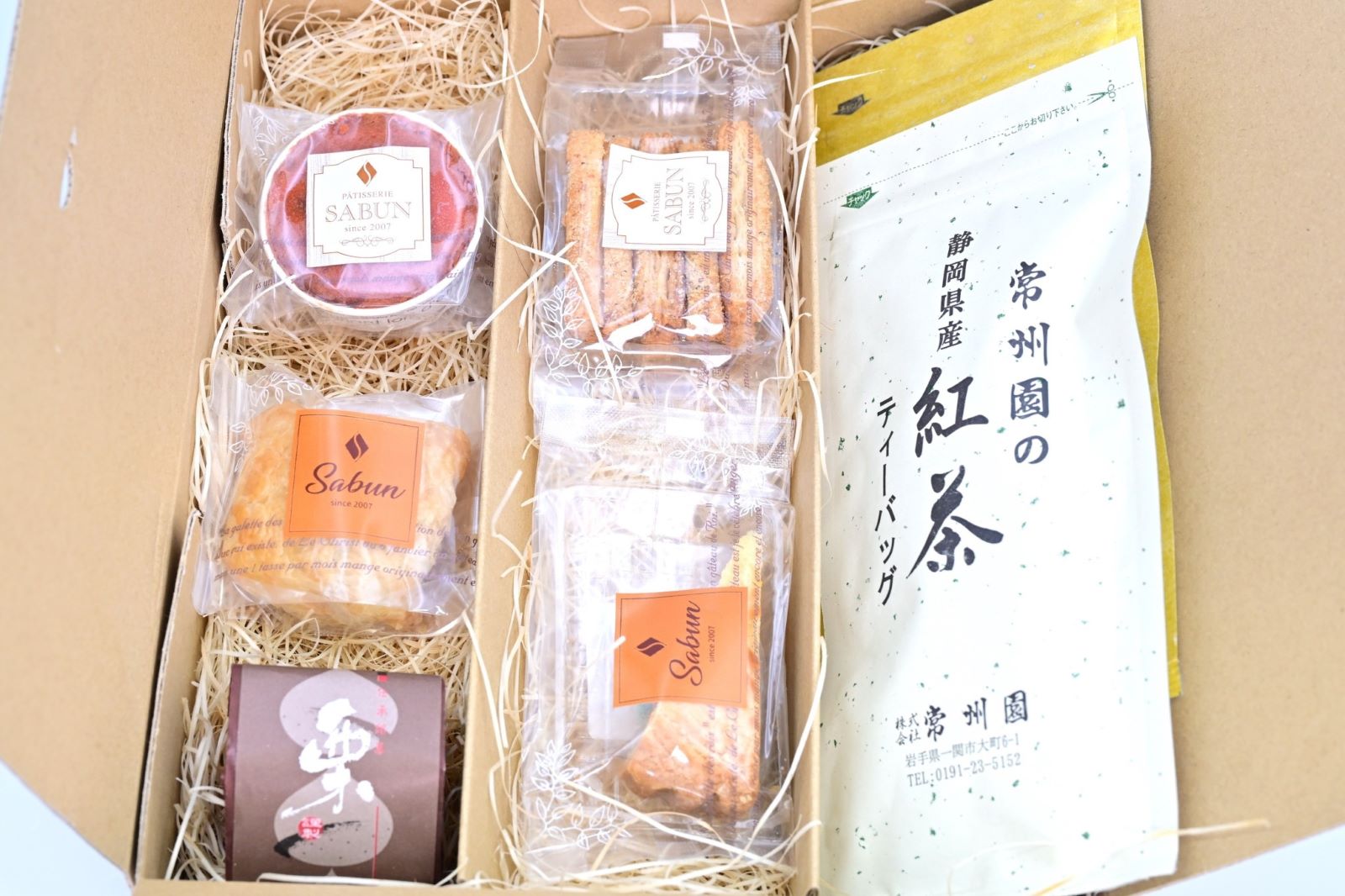 紅茶(ティーバッグ)、ほうじ茶(ティーバッグ)、焼き菓子(ラズベリー、オレンジパウンド、エンガディナー、焼きモンブラン、チーズパイ)