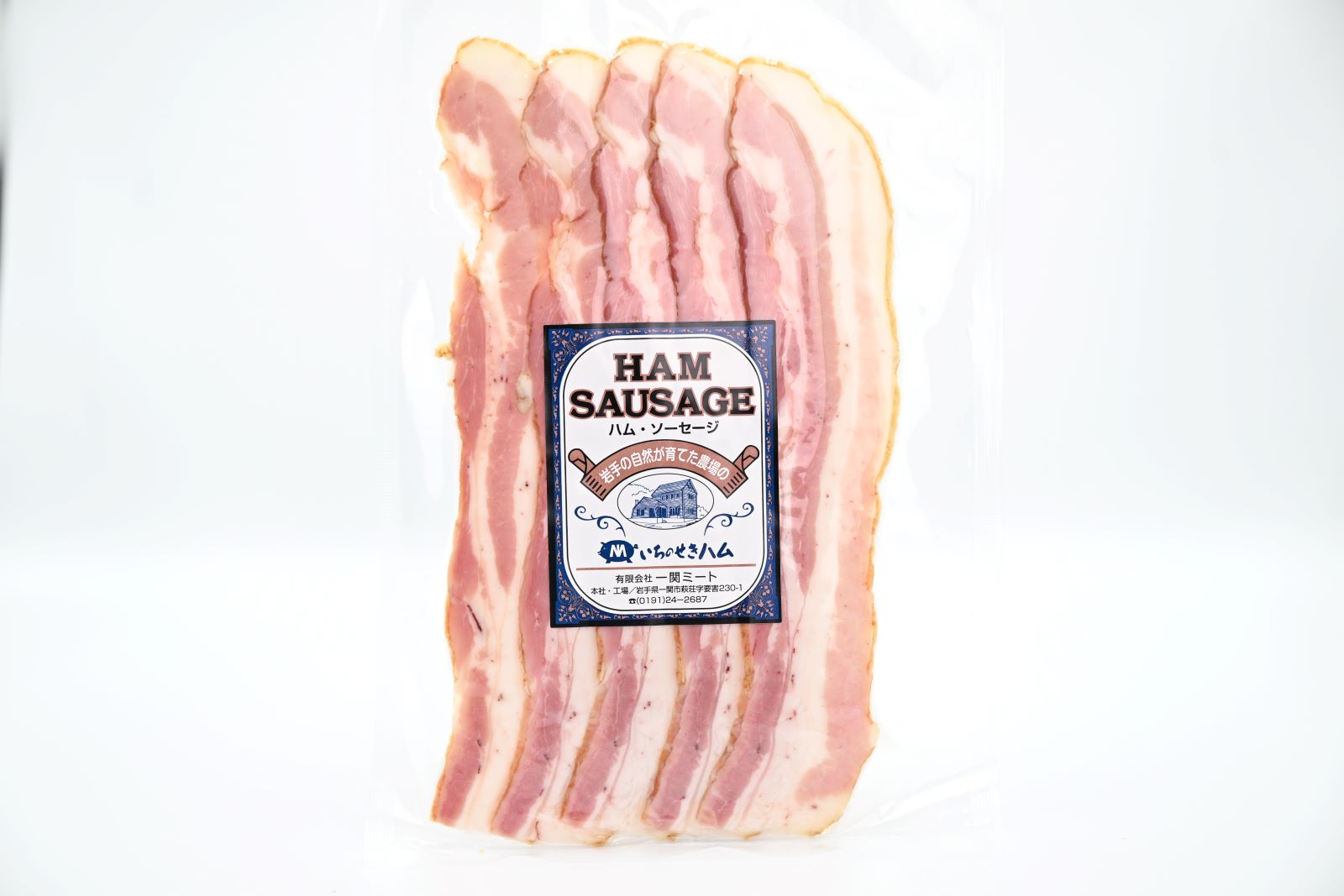 原材料名:豚バラ肉(岩手県産)、食塩、砂糖、還元水飴/リン酸塩(Na)、酸化防止剤(ビタミンC)、発色剤(亜硝酸Na)