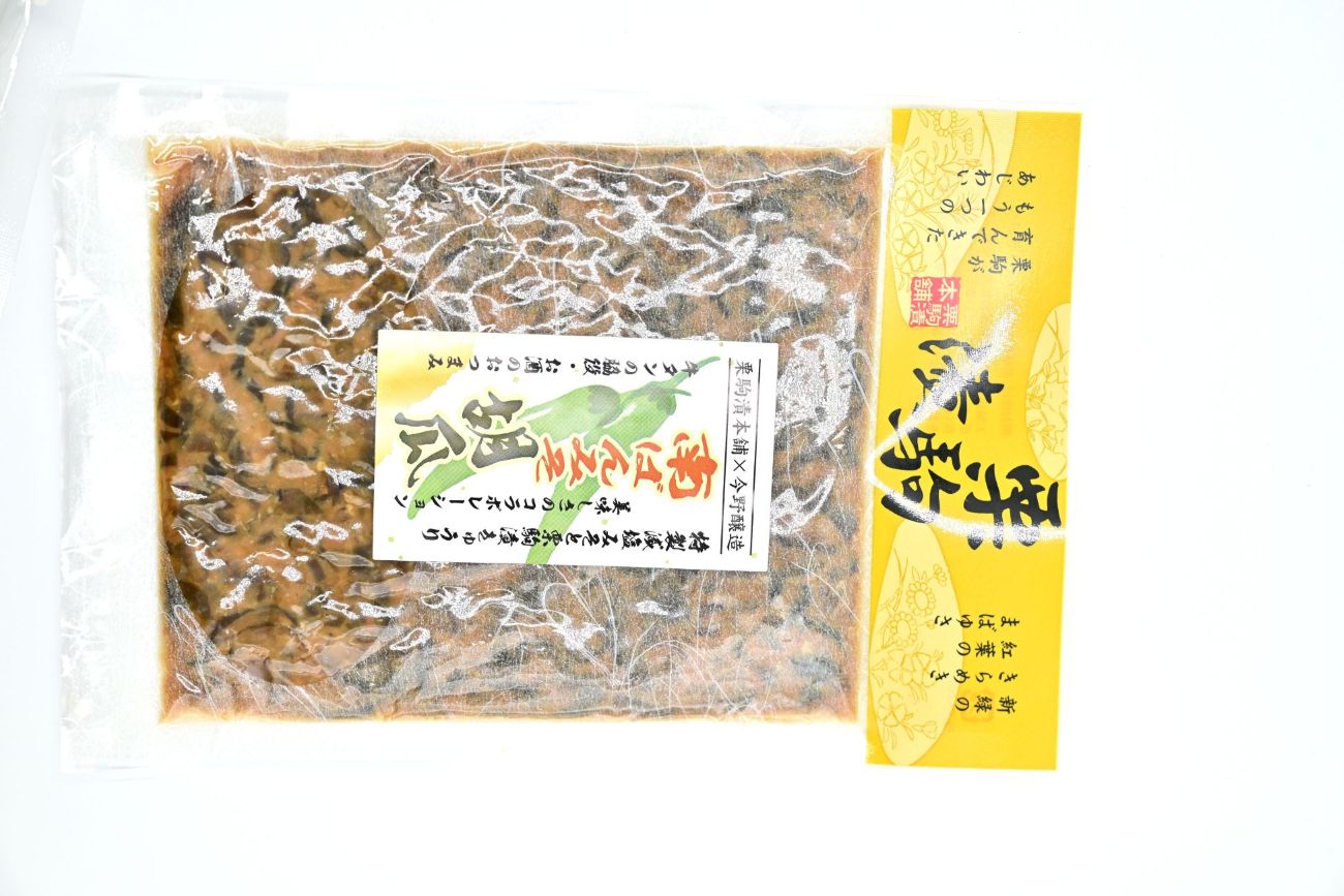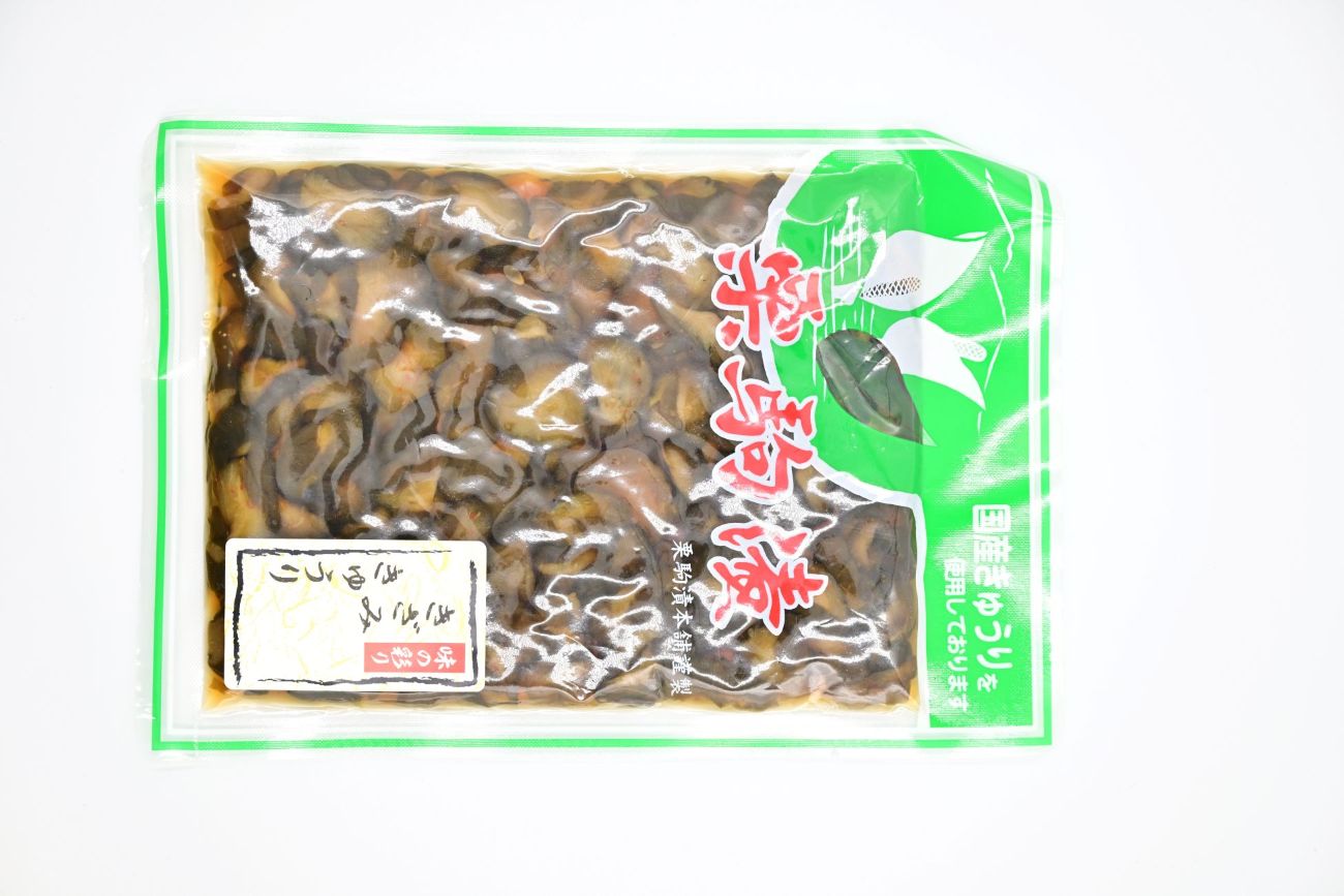 原材料名:胡瓜(国産)、青唐辛子(ベトナム)、昆布、漬け原材料【味噌(国産)、砂糖、醤油、砂糖混合ぶどう糖果糖液糖、貝エキス、醸造酢、りんご酢、かつおエキス】、(一部に大豆・小麦・りんごを含む)