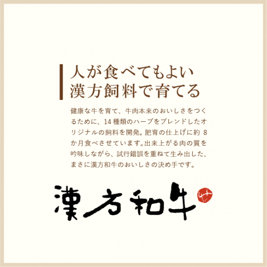 牛肉本来のおいしさ、肉質にこだわって試行錯誤を重ねて誕生したのが「漢方和牛」です。